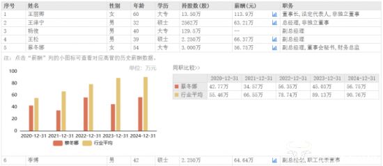 而尽管蔡冬娜身兼三职,除了未披露薪酬的副总经理杨俊,其薪酬仍为公司副总经理中最低的。过往财报显示,蔡冬娜2024年薪酬为56.75万元,相较于2023年的45.03万元,上涨了11.72万元,低于另外两位副总经理王松和李博。王松、李博2024年薪酬分别为66.37万元、64.64万元,相较于2023年的27.96万元、60.97万元,分别上涨了38.41万元、3.67万元。