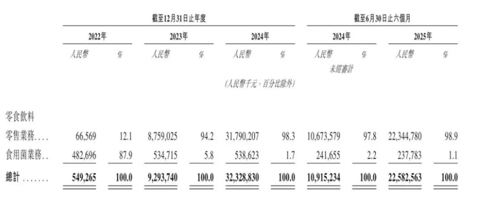 2023年起,万辰集团主要收入来自零食,并实现收入大幅增长。2023年-2025年上半年,公司来自零食的收入占比分别为94.2%、98.3%、98.9%,剩余收入来自食用菌。