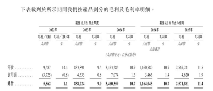 万辰集团食用菌业务各期的毛利率分别为-0.8%、0.8%、1.3%及1.9%。而零食业务各期毛利率分别为14.4%、9.5%、10.9%、11.5%。