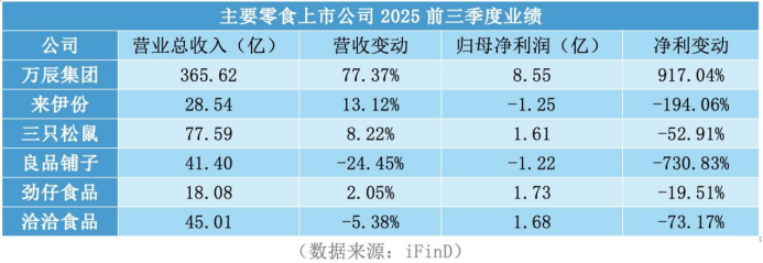 赢家似乎只是少数。多家公司利润不断缩水,尤其是来伊份和良品铺子,在2025年前三季度利润分别暴跌194.06%及730.83%,三只松鼠也面临着原材料成本上涨、线上平台费用提升的双重压力。这三家代表性的互联网零食品牌,凭借精致的包装和互联网的营销曾风靡一时,但现在光环似乎正在褪去。