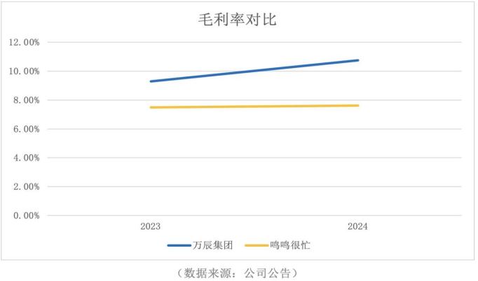 数据显示, 2023-2024年万辰集团的毛利率略高于鸣鸣很忙。