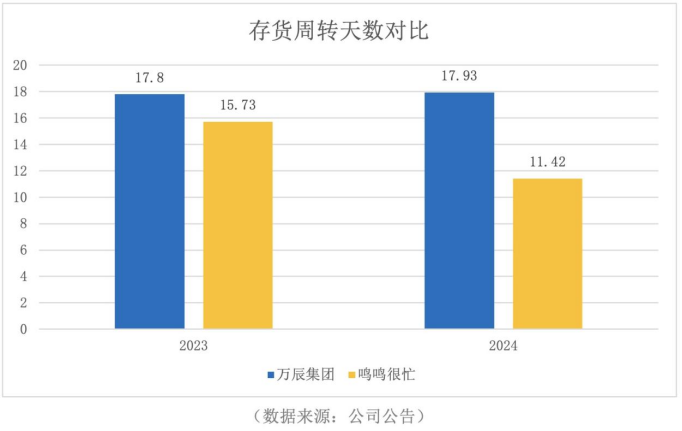 但在此期间,鸣鸣很忙存货周转天数分别为15.73天、11.42天;万辰集团存货周转天数分别为17.8天、17.93天。由此可见,万辰毛利虽优于鸣鸣,但存货周转暂时跑输。