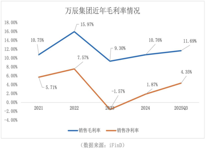 根据万辰集团公告,2025年前三季度365.62亿元的营业总收入与8.55亿元的净利润存在着四十几倍的价差,销售净利率为4.35%。