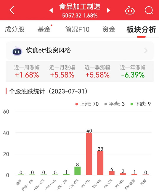 数据显示,截至今日,食品加工制造板块近一周涨幅1.68%,近一月涨幅5.58%,近一季涨幅5.58%。