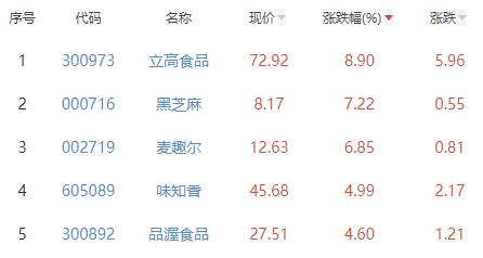 其中,立高食品、黑芝麻、麦趣尔、味知香、品渥食品位列板块涨幅前五位,涨幅分别为8.90%、7.22%、6.85%、4.99%、4.60%。