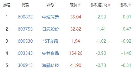 中炬高新、日辰股份、*ST交昂、安井食品、海融科技位列涨幅榜后五位,涨幅分别为-2.53%、-1.41%、-1.02%、-0.90%、-0.73%。