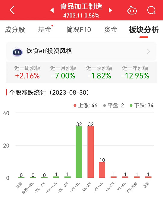 中国经济网北京8月30日讯 今日,食品加工制造板块整体涨幅0.56%,其中,46只股票上涨,2只股票平盘,34只股票下跌。