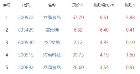 其中,立高食品、康比特、*ST交昂、海融科技、品渥食品位列板块涨幅前五位,涨幅分别为9.51%、6.40%、4.95%、4.19%、3.54%。