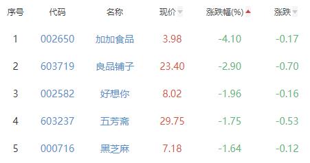 加加食品、良品铺子、好想你、五芳斋、黑芝麻位列涨幅榜后五位,涨幅分别为-4.10%、-2.90%、-1.96%、-1.75%、-1.64%。