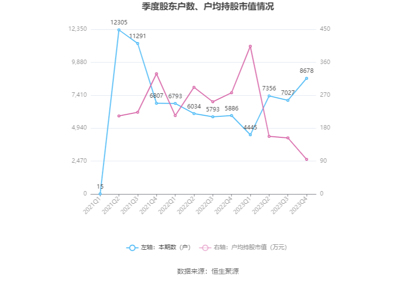 筹码集中度方面,截至2023年年末,公司股东总户数为8678户,较三季度末增长了1651户,增幅23.50%;户均持股市值由三季度末的153.39万元下降至94.74万元,降幅为38.24%。