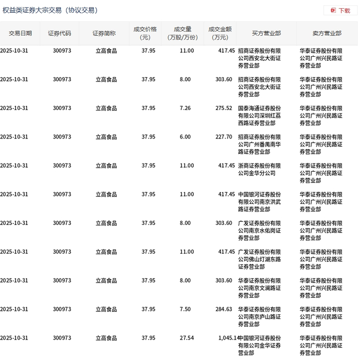 10月31日,立高食品大宗交易成交116.3万股,成交额4413.59万元,占当日总成交额的21.09%,成交价37.95元,较市场收盘价41.65元折价8.88%。