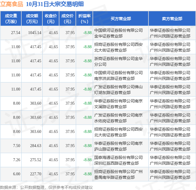 10月31日立高食品发生11笔大宗交易 成交金额4413.59万元