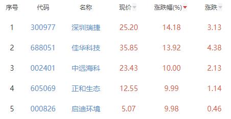 其中,深圳瑞捷、佳华科技、中远海科、正和生态、启迪环境(维权)位列板块涨幅前五位,涨幅分别为14.18%、13.92%、10.00%、9.99%、9.98%。