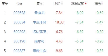 雪迪龙、中兰环保、远达环保、维尔利、绿茵生态位列涨幅榜后五位,涨幅分别为-8.09%、-7.54%、-6.89%、-5.54%、-5.38%。