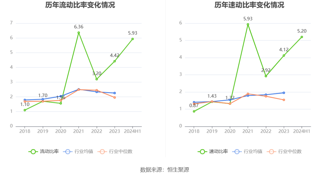 2024年上半年,公司流动比率为5.93,速动比率为5.20。