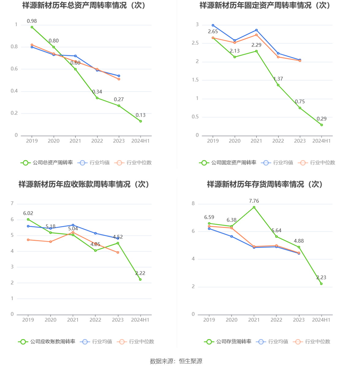 营运能力方面,2024年上半年,公司总资产周转率为0.13次,上年同期为0.14次(2023年上半年行业平均值为0.25次,公司位居同行业19/21);固定资产周转率为0.29次,上年同期为0.53次(2023年上半年行业平均值为1.23次,公司位居同行业16/21);公司应收账款周转率、存货周转率分别为2.22次、2.23次。