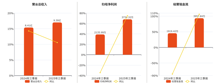 公司营业总收入为9.30亿元。归母净利润为3734.32万元,在已披露的同业公司中排名第127。经营活动现金净流入为3957.84万元。