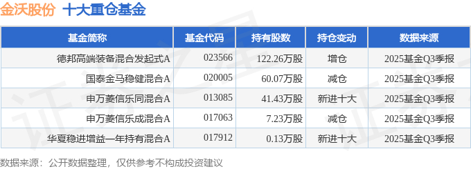 持有金沃股份最多的基金为德邦高端装备混合发起式A,目前规模为0.58亿元,最新净值1.135(10月30日),较上一交易日下跌3.45%。该基金现任基金经理为陆阳。
