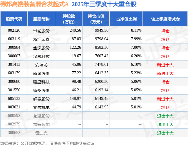 根据2025基金Q3季报公募基金重仓股数据,重仓该股的公募基金共5家,其中持有数量最多的公募基金为德邦基金的德邦高端装备混合发起式A。德邦高端装备混合发起式A目前规模为0.58亿元,最新净值1.2321(12月30日),较上一交易日上涨7.09%。该公募基金现任基金经理为陆阳。陆阳在任的基金产品包括:德邦稳盈增长灵活配置混合A,管理时间为2023年10月25日至今,期间收益率为11.87%;德邦鑫星价值灵活配置混合A,管理时间为2024年1月30日至今,期间收益率为297.34%;