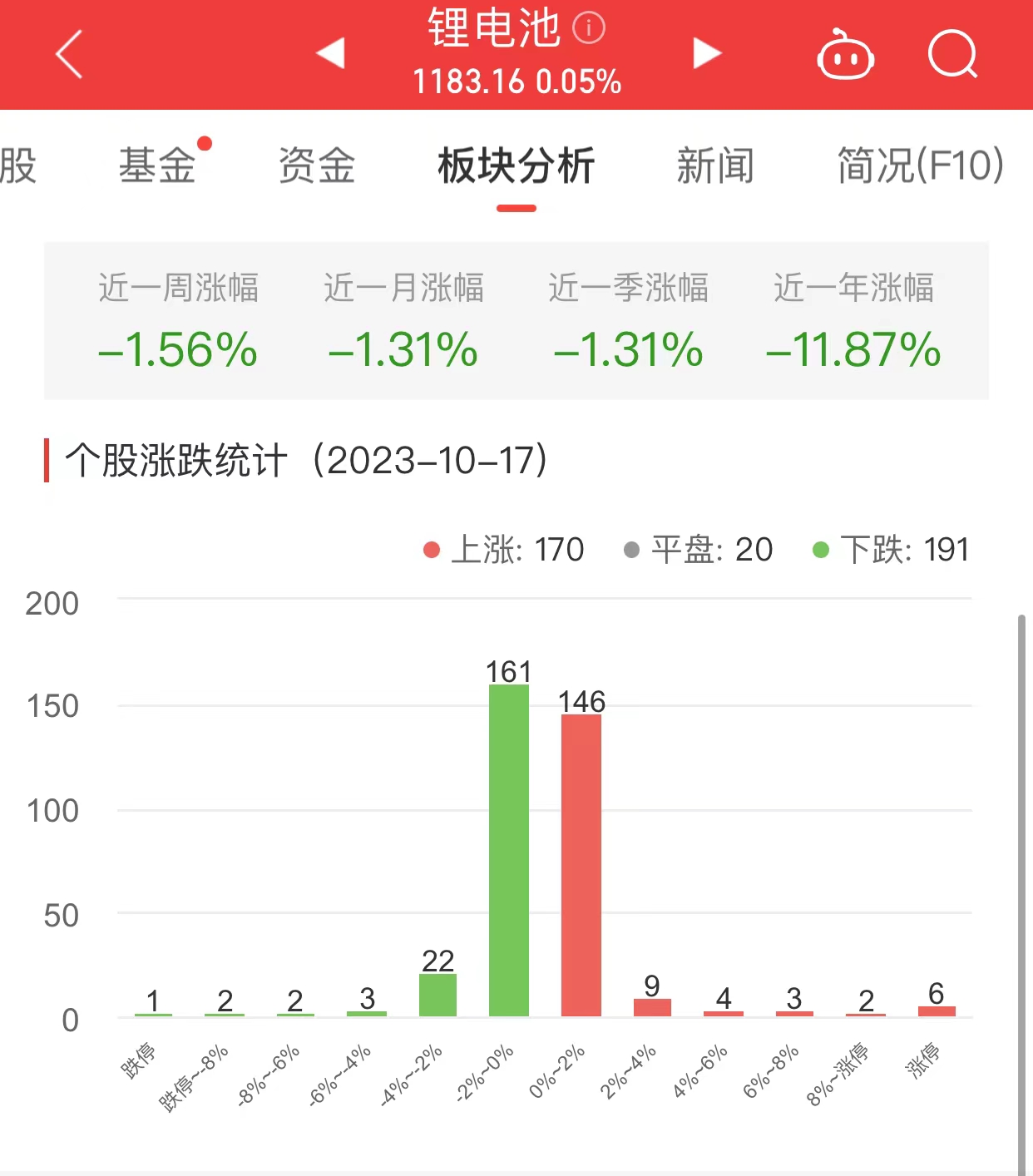 中国经济网北京10月17日讯今日,锂电池板块整体涨幅0.05%,其中170只股票上涨,20只股票平盘,191只股票下跌。
