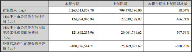 今年上半年,公司实现营业收入126,351.39万元,同比增长58.04%,公司实现归属于上市公司股东的净利润12,489.49万元,同比增长466.71%,公司实现归属于上市公司股东的扣除非经常性损益的净利润12,189.22万元,同比增长507.59%;经营活动产生的现金流量净额为-10,072.65万元,同比减少500.20%。