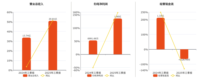 公司营业总收入为20.81亿元。归母净利润为1.80亿元。经营活动现金净流入为-4126.49万元,较去年同报告期经营活动现金净流入减少1.74亿元,同比较去年同期下降131.14%。