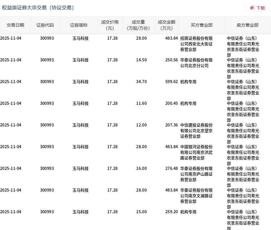 玉马科技今日大宗交易折价成交187.8万股,成交额3245.19万元