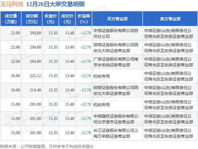 12月26日玉马科技现8笔折价12.7%的大宗交易 合计成交1926.92万元