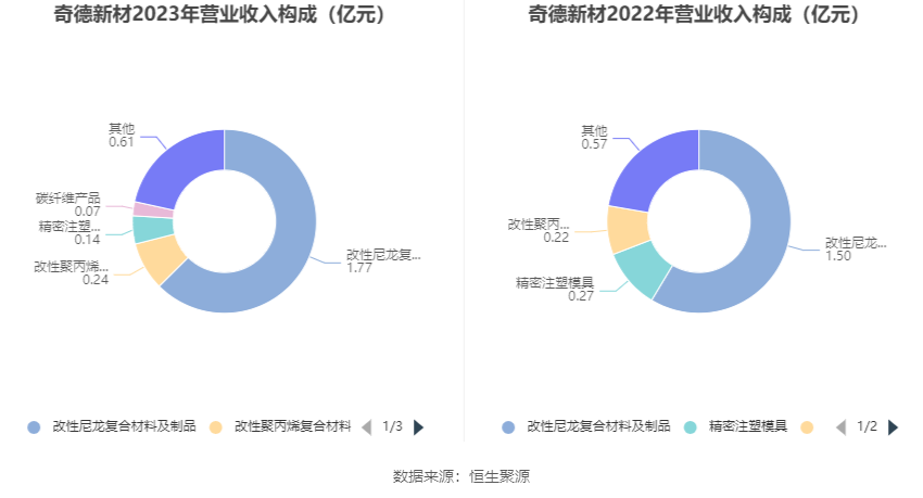 数据统计显示,奇德新材近三年营业总收入复合增长率为-7.74%,在改性塑料行业已披露2023年数据的5家公司中排名第5。近三年净利润复合年增长率为-54.28%,排名5/5。