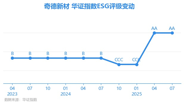 日前,华证指数公布了新一期(2025年7月31日)的ESG评级结果,奇德新材(300995.SZ)获得AA评级(华证指数评级为C起至AAA九档,C为最低档,AAA为其最高一级评级/AA为其第二档),上一期(2025年4月30日)ESG评级为AA。本期ESG评级在462家化学制品行业A股上市公司中排名第15(上一期排名第15)。
