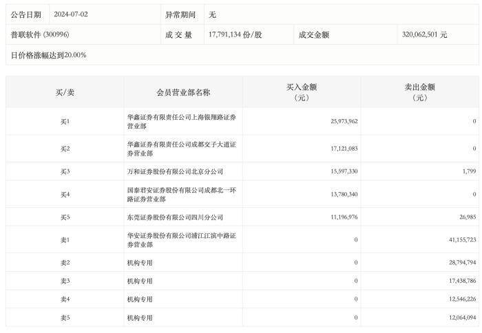 7月2日,普联软件今日涨停,龙虎榜数据显示,上榜营业部席位全天成交1.96亿元,占当日总成交金额比例为61.14%。其中,买入金额为8366.97万元,卖出金额为1.12亿元,合计净卖出2835.87万元。