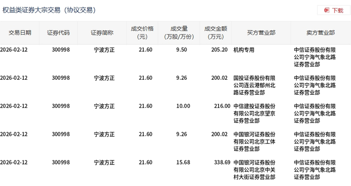 2月12日,宁波方正大宗交易成交53.7万股,成交额1159.93万元,占当日总成交额的15.3%,成交价21.6元,较市场收盘价24.55元折价12.02%。
