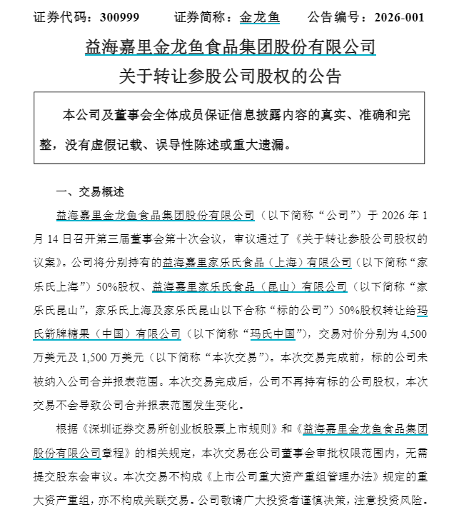 1月15日晚,益海嘉里金龙鱼食品集团股份有限公司(以下简称“金龙鱼”)公告称,公司于2026年1月14日召开第三届董事会第十次会议,审议通过了《关于转让参股公司股权的议案》。
