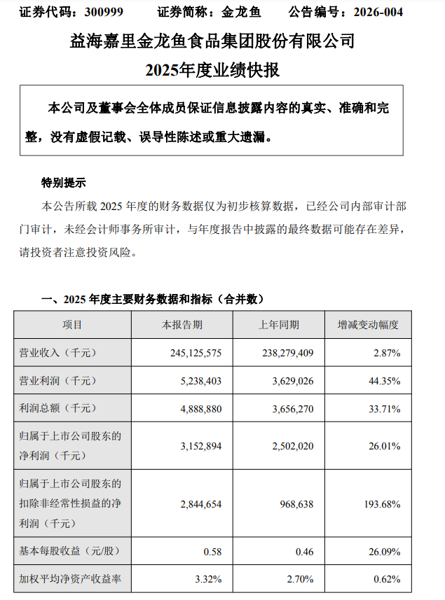 2026年2月26日,益海嘉里金龙鱼食品集团股份有限公司(以下简称“金龙鱼”)发布《2025年度业绩快报》公告显示,其2025年业绩重回增长态势,营收净利双双攀升。全年实现营收2451.26亿元,同比增长2.87%;实现净利润31.53亿元,同比增长26.01%,成功扭转此前连续两年下滑的颓势。然而,业绩回暖的背后暗藏隐忧——公司同时披露,旗下两家子公司因诉讼及税务纠纷合计计提预计负债超7亿元,给这份回暖的业绩增添了一丝不确定性。