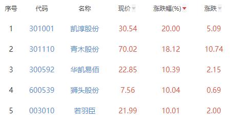 其中,凯淳股份、青木股份、华凯易佰、狮头股份、若羽臣位列板块涨幅前五位,涨幅分别为20.00%、18.12%、10.38%、10.04%、10.01%。