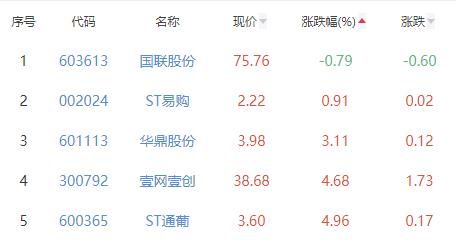 国联股份、ST易购、华鼎股份、壹网壹创、ST通葡位列涨幅榜后五位,涨幅分别为-0.79%、0.91%、3.11%、4.68%、4.96%。