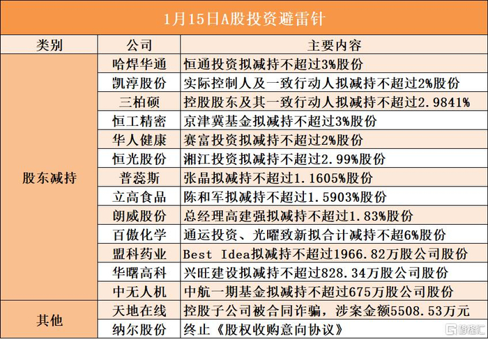1月15日A股投资避雷针︱凯淳股份:实际控制人及一致行动人拟减持不超过2%股份