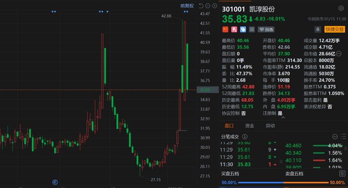 格隆汇1月15日|昨日20cm涨停的凯淳股份(301001.SZ)大跌16%,该股近期走出大涨大跌的过山车行情。现报36.8元,总市值跌破30亿元。凯淳股份昨日晚间公告称,公司股票交易价格连续3个交易日收盘价涨幅偏离值累计超过30%,属于股票交易异常波动情况。经核实,公司前期披露的信息不存在需要补充、更正之处,近期公司经营情况及内外部经营环境未发生重大变化,公司、控股股东及实际控制人不存在关于公司的应披露而未披露的重大事项。控股股东王莉及一致行动人徐磊拟合计减持不超2%公司股份。