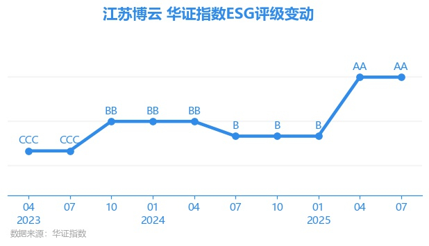 日前,华证指数公布了新一期(2025年7月31日)的ESG评级结果,江苏博云(301003.SZ)获得AA评级(华证指数评级为C起至AAA九档,C为最低档,AAA为其最高一级评级/AA为其第二档),上一期(2025年4月30日)ESG评级为AA。本期ESG评级在462家化学制品行业A股上市公司中排名第25(上一期排名第25)。