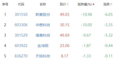 斯菱股份、华懋科技、福赛科技、金鸿顺、天铭科技位列涨幅榜后五位,涨幅分别为-10.98%、-10.00%、-9.67%、-1.87%、-1.33%。