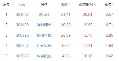 其中,德迈仕、维科精密、博俊科技、川环科技、威帝股份位列板块涨幅前五位,涨幅分别为20.01%、19.99%、12.75%、11.31%、10.10%。