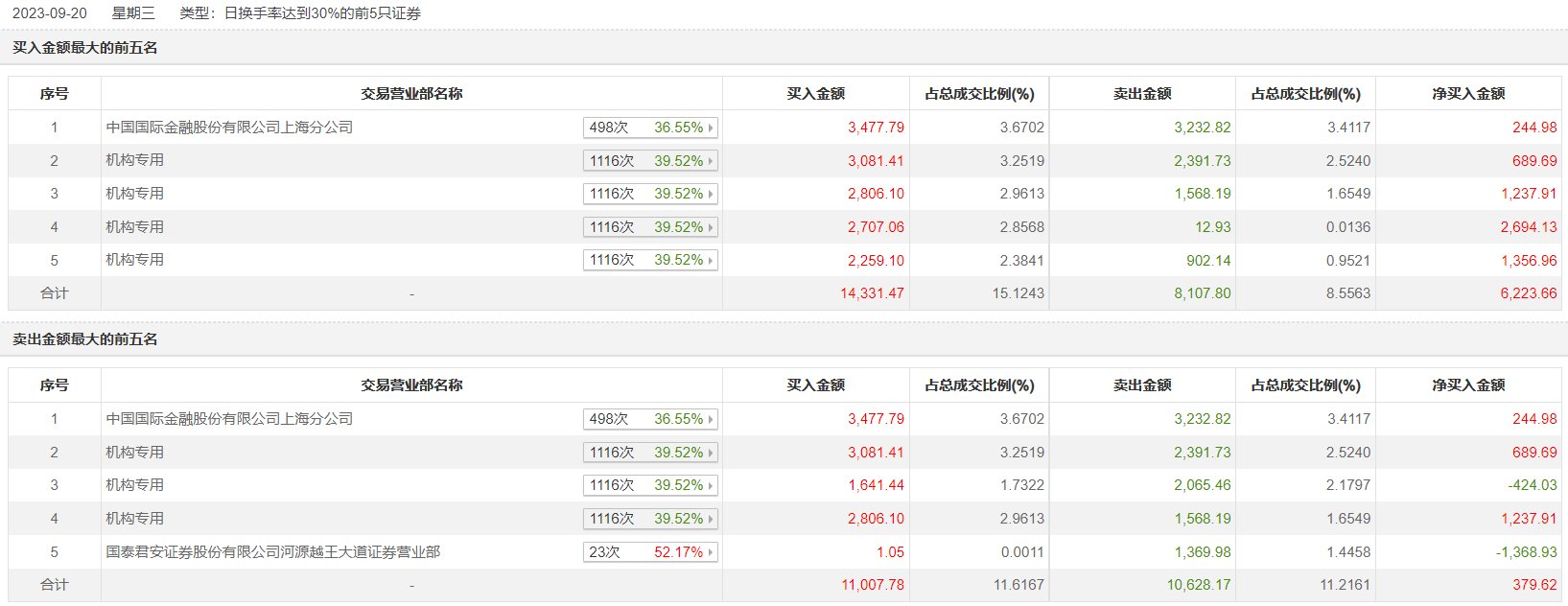 具体来看,机构买入1.25亿元,卖出6940.45万元,合计净买入5554.66万元。此外,中国国际金融上海分公司、国泰君安证券河源越王大道证券营业部分别卖出3232.82万元、1369.98万元;中国国际金融上海分公司、国泰君安证券河源越王大道证券营业部分别买入3477.79万元、1.05万元。