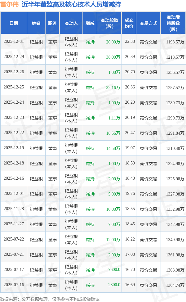 雷尔伟:12月31日高管纪益根减持股份合计20万股