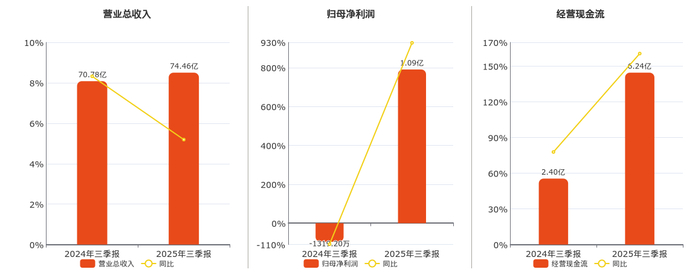 公司营业总收入为74.46亿元。归母净利润为1.09亿元。经营活动现金净流入为6.24亿元。