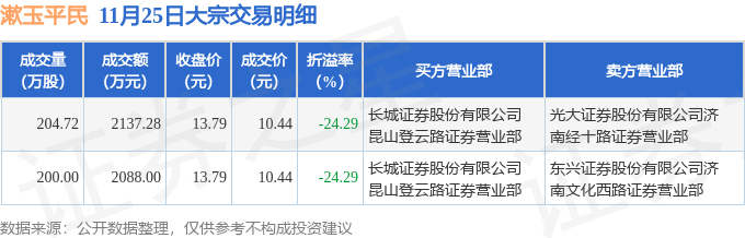 11月25日漱玉平民现2笔折价24.29%的大宗交易 合计成交4225.28万元