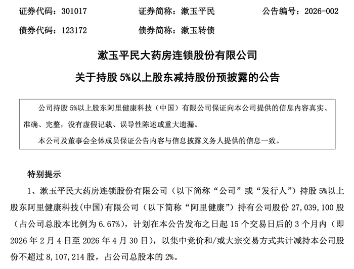 阿里健康年内第二次计划减持漱玉平民股份,叠加实控人及核心高管的密集套现,在医药零售行业转型深水区的背景下,这家区域连锁药房龙头的资本动向引发市场高度关注。1月13日,漱玉平民(301017)披露的减持公告显示,持股5%以上股东阿里健康科技(中国)有限公司计划减持不超过公司总股本2%的股份,而就在一年前,阿里健康刚刚完成首次减持,这一系列动作背后,既折射出单一股东的资金调配需求,也暗藏着行业规模扩张退潮后的转型压力。