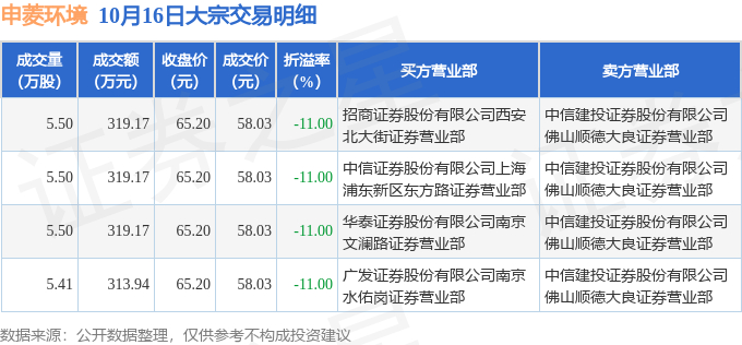 10月16日申菱环境现4笔折价11%的大宗交易 合计成交1271.45万元
