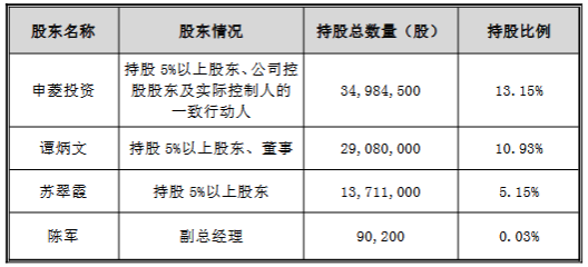 截至公告披露日,申菱投资持有公司股份34,984,500股(占公司总股本比例为13.15%);谭炳文持有公司股份29,080,000股(占公司总股本比例为10.93%);苏翠霞持有公司股份13,711,000股(占公司总股本比例为5.15%);陈军持有公司股份90,200股(占公司总股本比例为0.03%)。