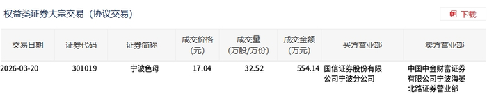 3月20日,宁波色母大宗交易成交32.52万股,成交额554.14万元,占当日总成交额的13.5%,成交价17.04元,较市场收盘价20.68元折价17.6%。