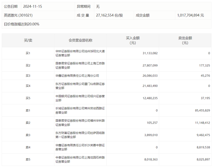 英诺激光今日涨停,龙虎榜数据显示,上榜营业部席位全天成交2.54亿元,占当日总成交金额比例为24.98%。其中,买入金额为1.31亿元,卖出金额为1.23亿元,合计净买入782.06万元。